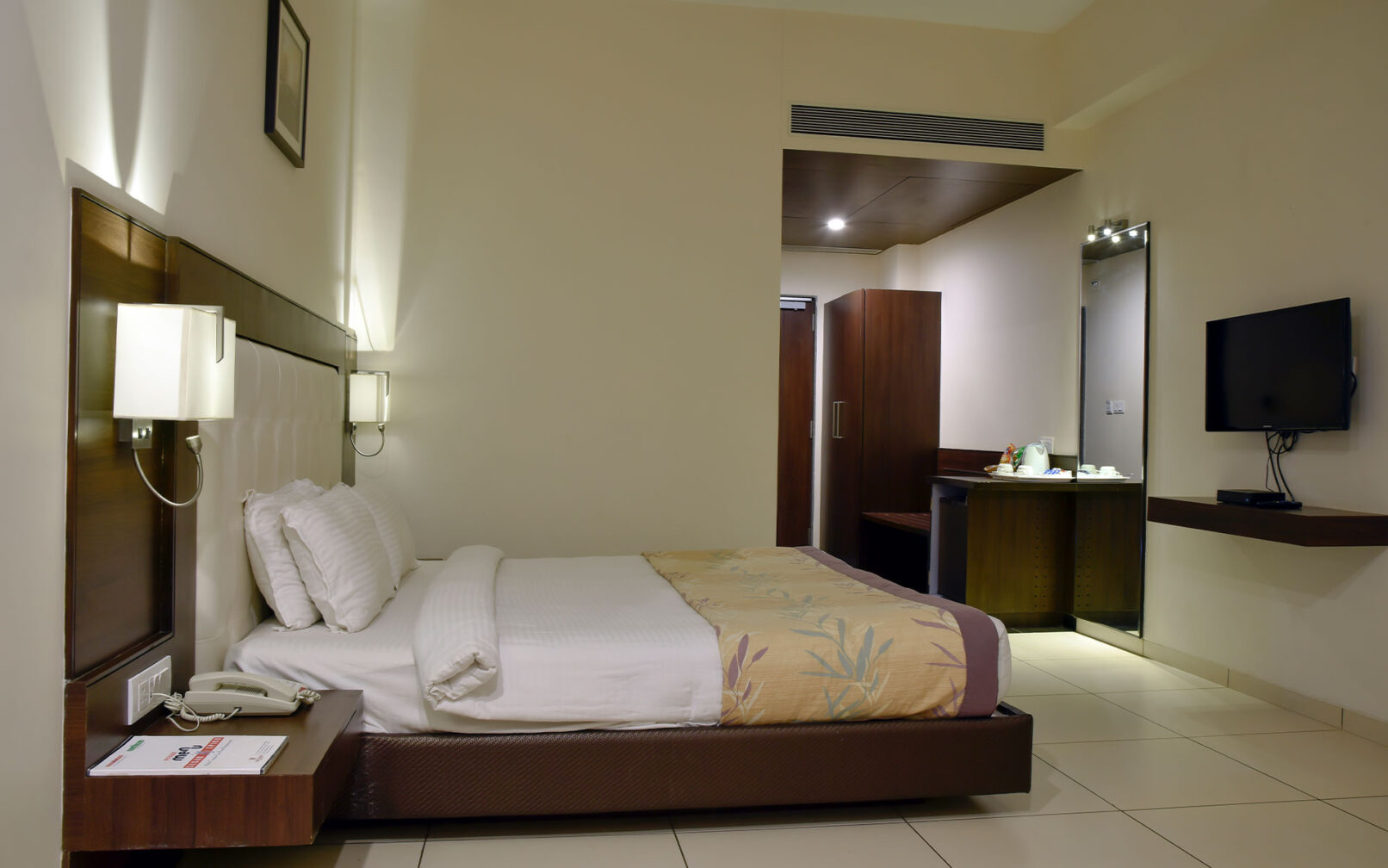 These 250 sq. ft deluxe luxury rooms are well-appointed with modern amenities and comfort. It comes complete with a host of amenities including a work space, relaxing lounge chair, comfortable King Size bed, TV and a soothing décor creating a perfect abode after busy working day.